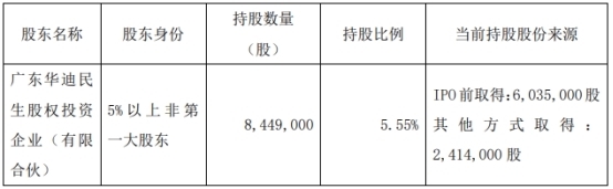 截至公告披露日,华迪民生持有公司8,449,000股,占公司总股本的5.55%。以上股份均来源于公司首次公开发行前及公司上市后资本公积转增股本取得的股份,且于2021年4月9日起上市流通。