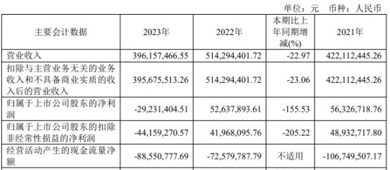 2023年,京源环保实现营业收入3.96亿元,同比下降22.97%;归属于上市公司股东的净利润-2923.14万元,同比下降155.53%;归属于上市公司股东的扣除非经常性损益的净利润-4415.93万元,同比下降205.22%;经营活动产生的现金流量净额-8855.08万元,上年同期为-7257.98万元。
